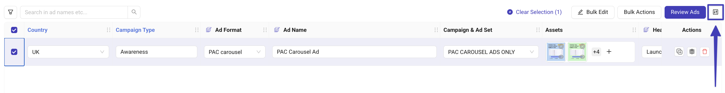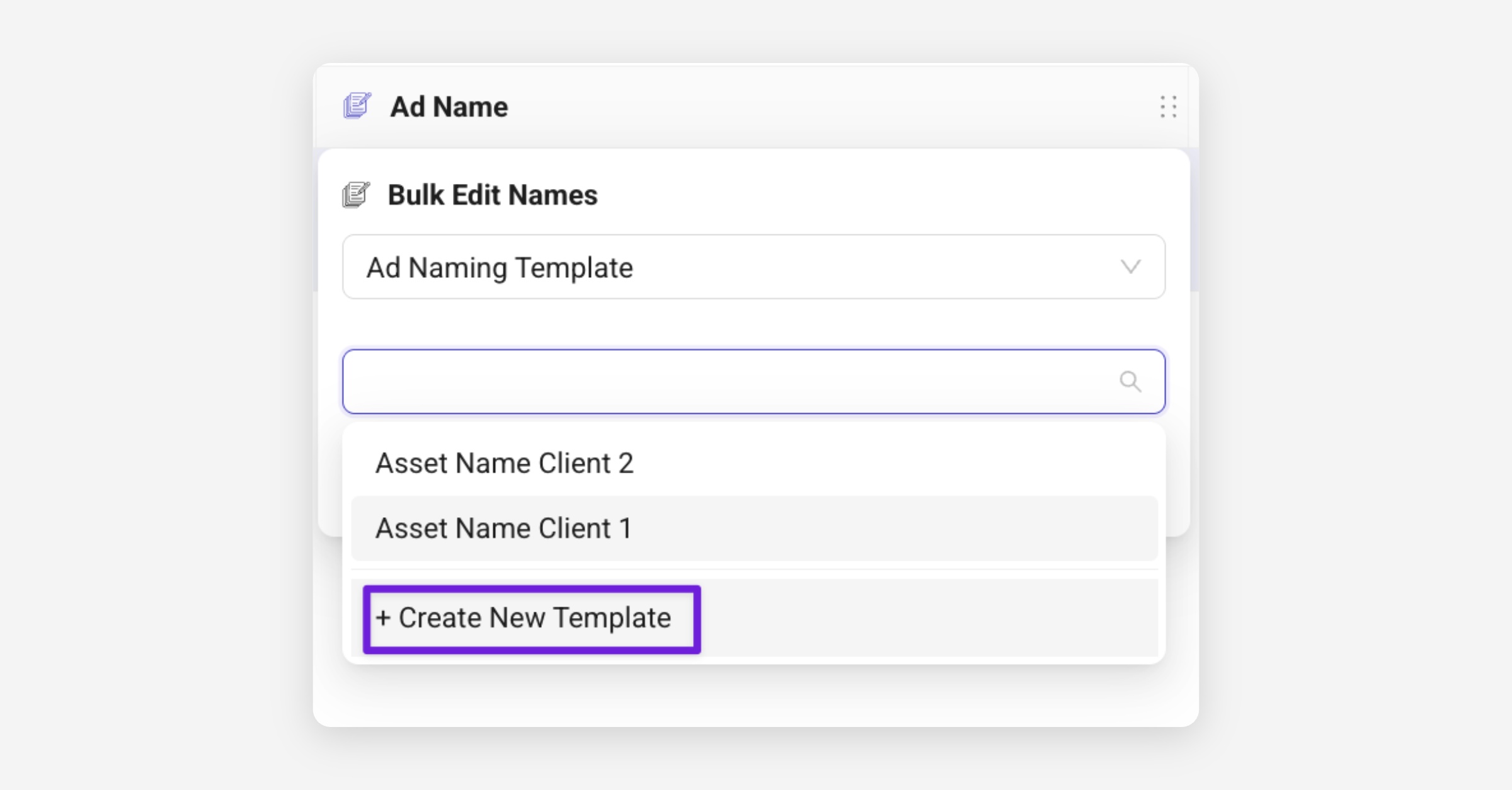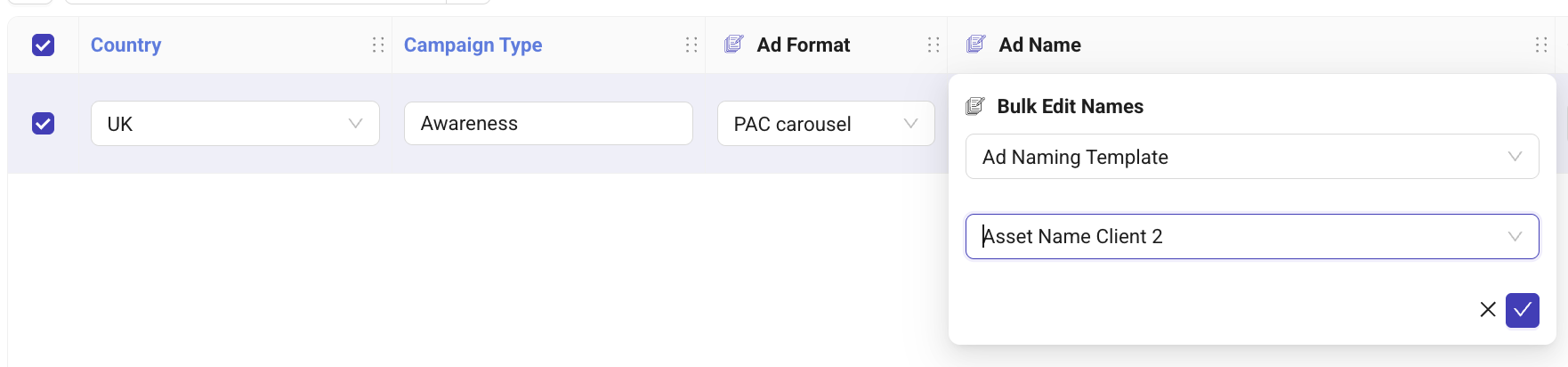 Select one or multiple rows, open the Ad Name column header, choose Ad Naming Template, select your template and Kitchn instantly generates names based on the values in each row.