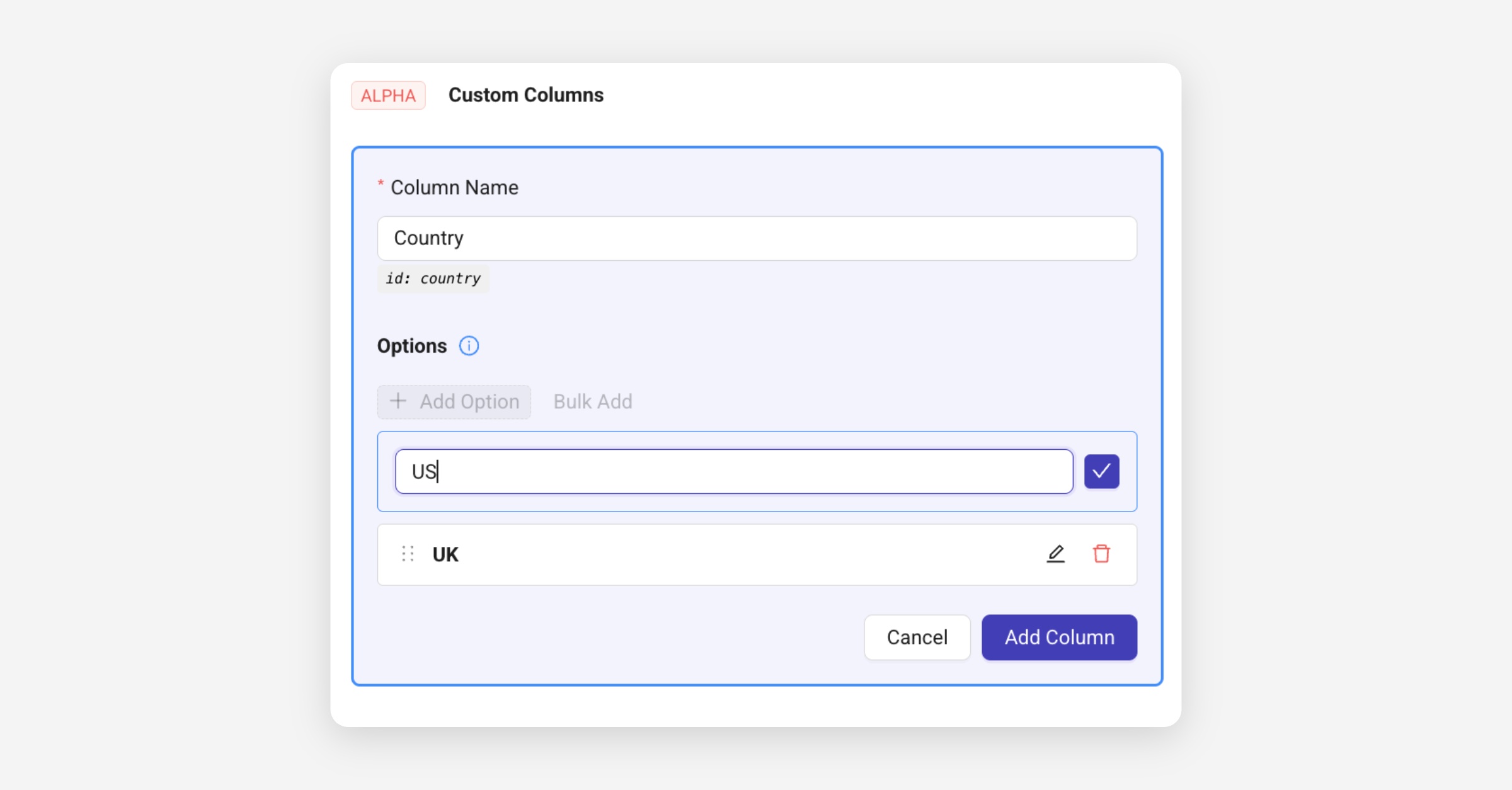To create a dropdown column, name it and start adding options. You can add options one by one or in bulk.