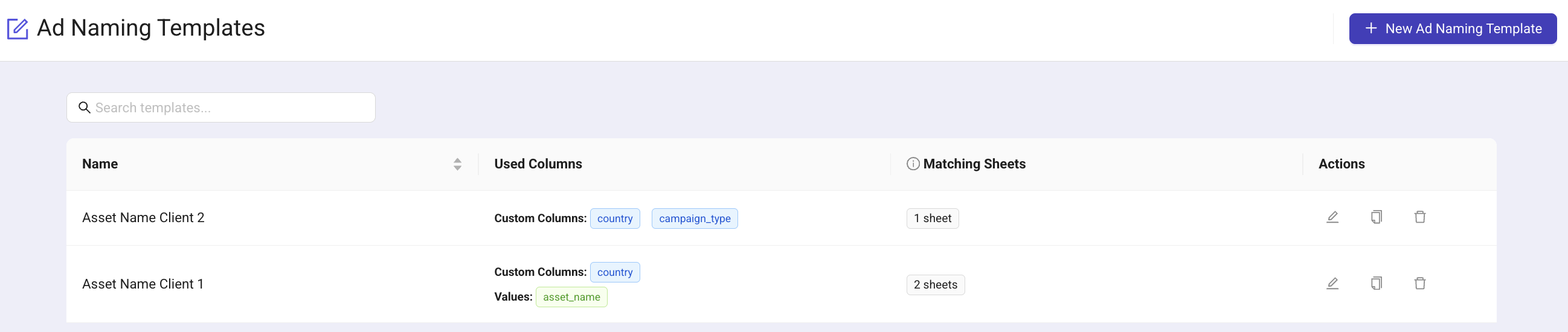 From the sidebar, you can access the Ad Naming Templates page, users can search, edit, update, duplicate, or delete a template. You can also see which Custom Columns each template uses.