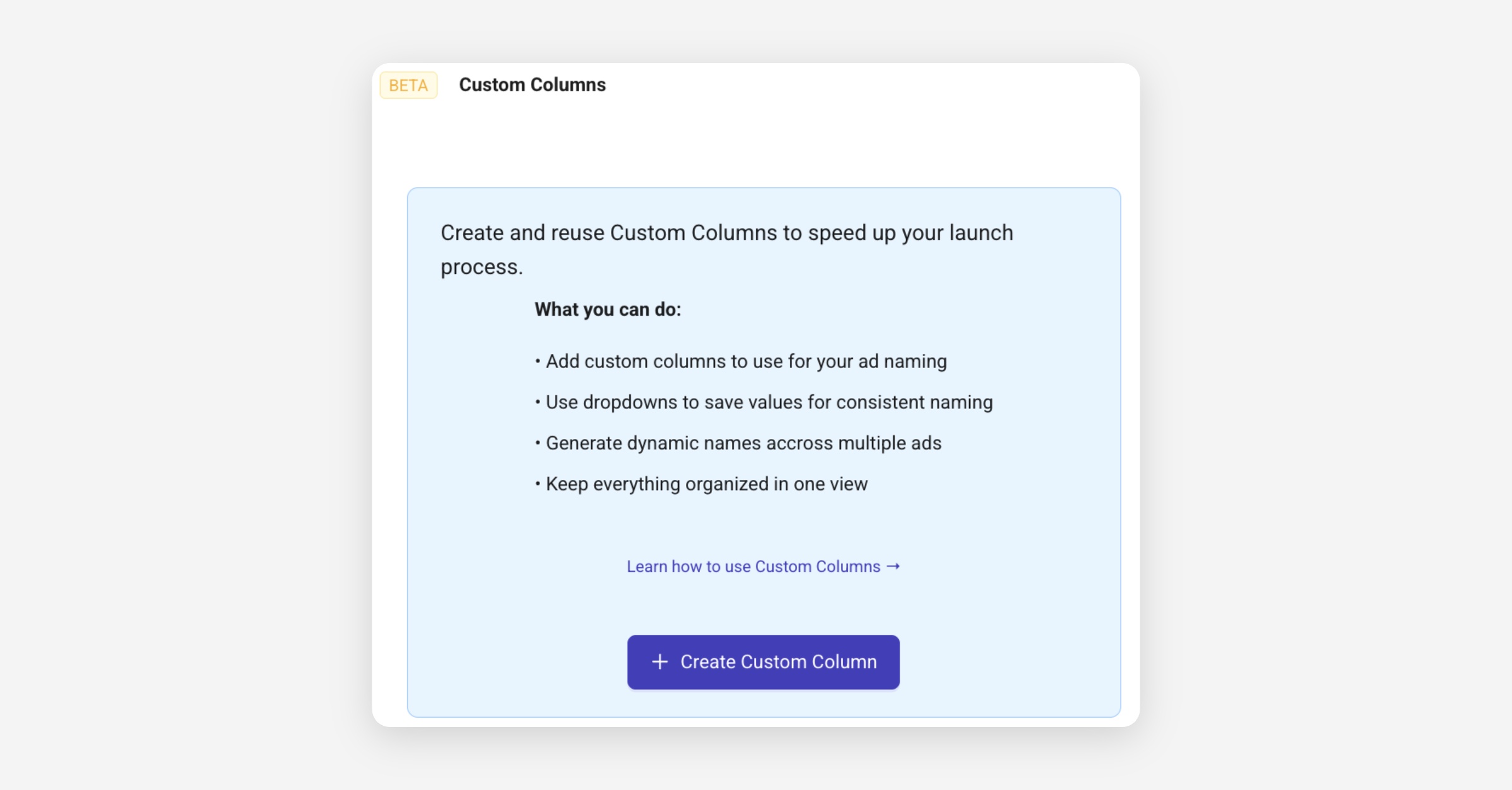 They let you add your own fields to the Launch Sheet and use them inside your Ad Naming Templates. They are ideal for values like Country, Offer, Funnel Stage, Creator, Campaign Code and anything your naming structure depends on.
