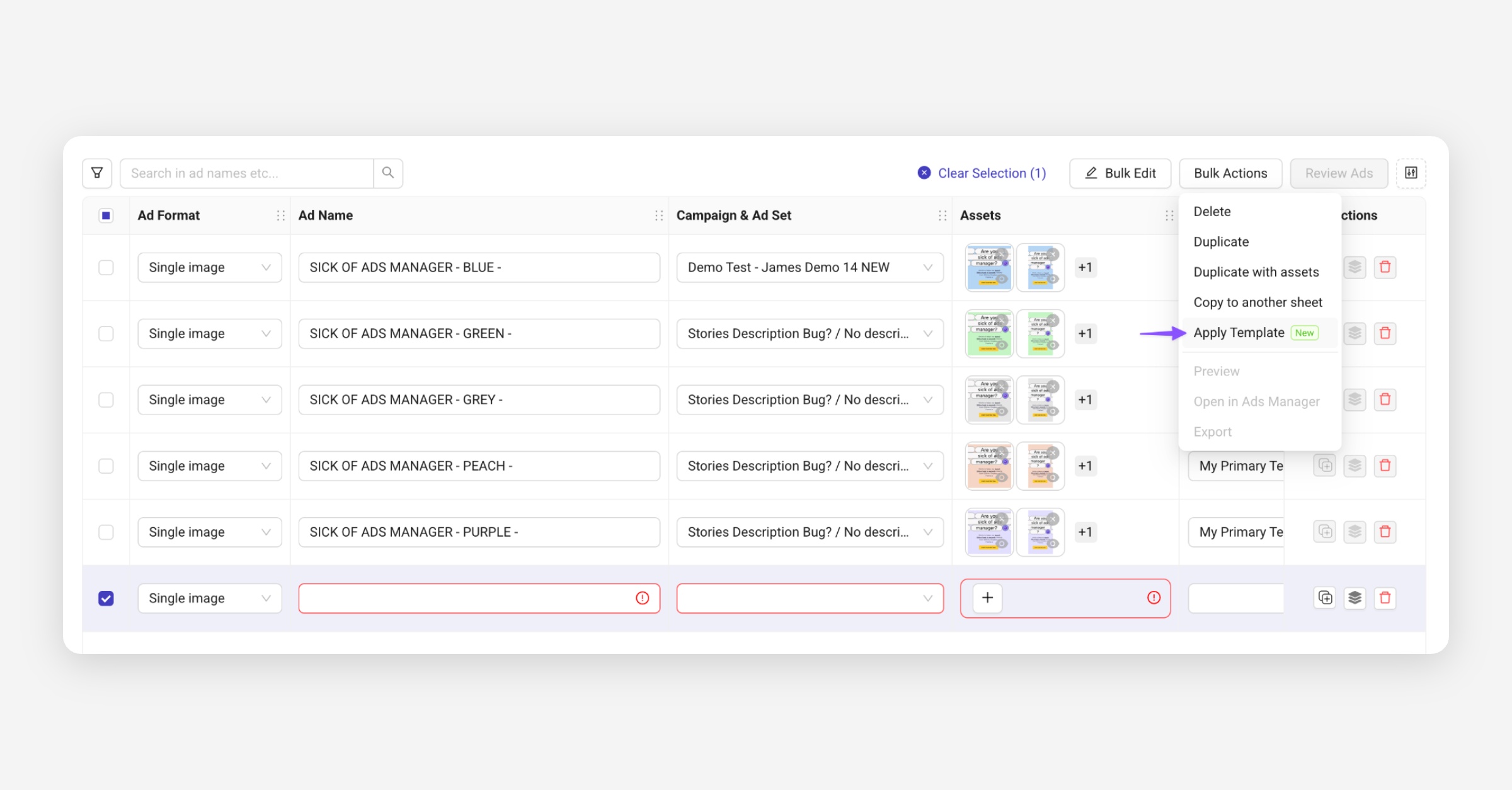 To apply a saved template, select one or multiple ads in your sheet and go to Bulk Actions → Apply Template.