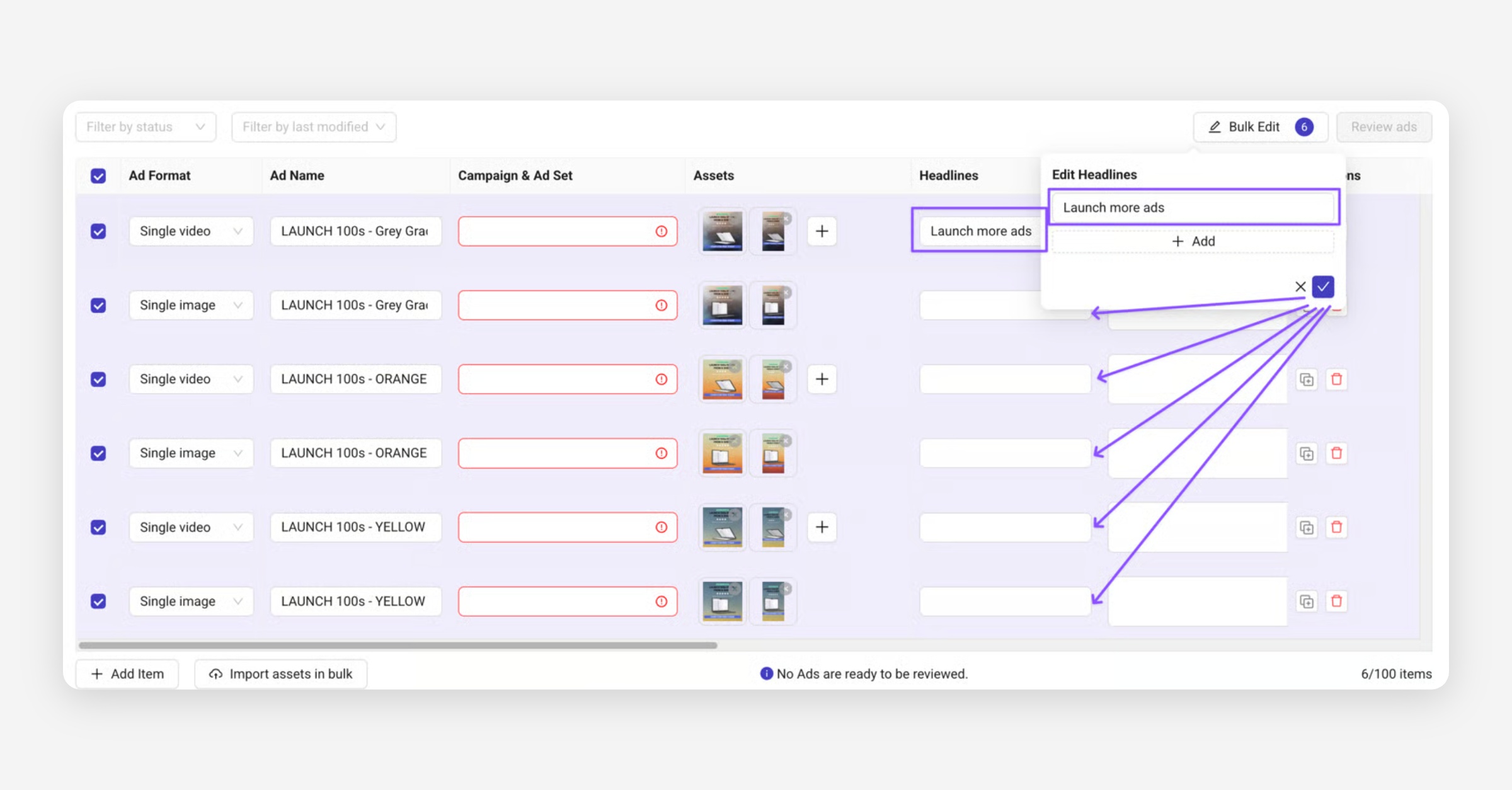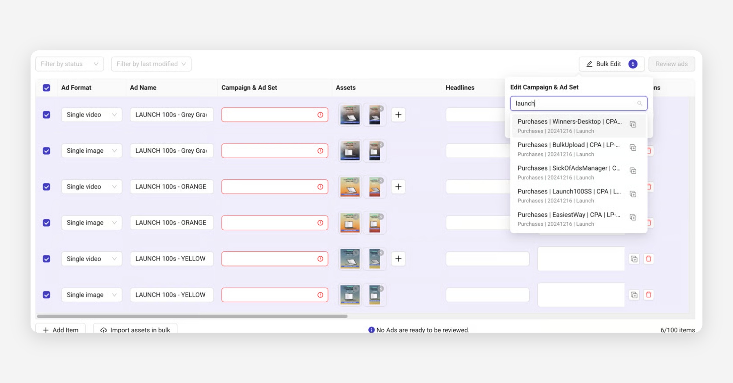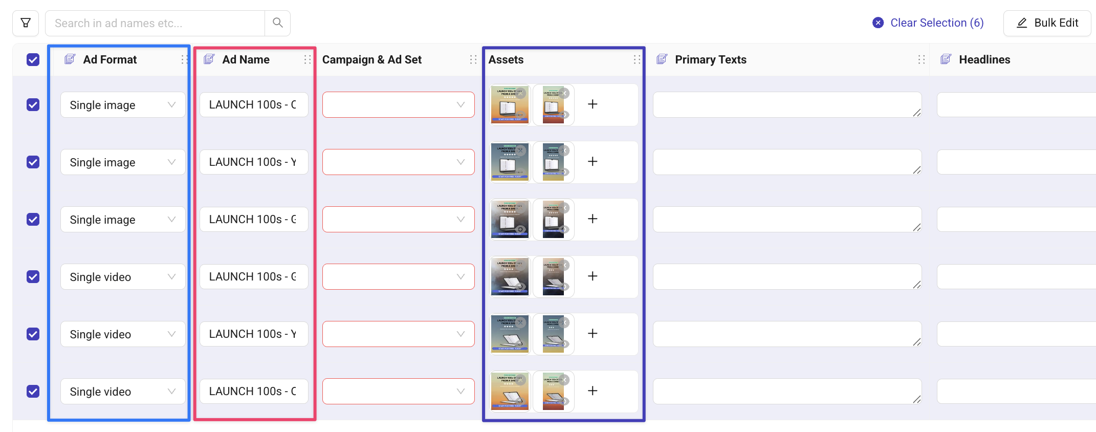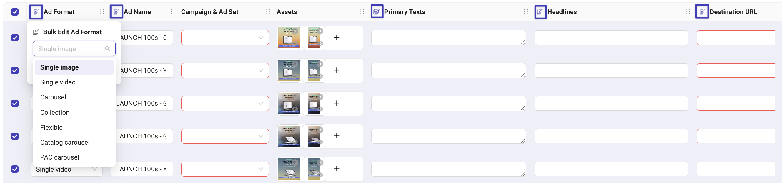 Once you have added your creative assets in bulk to the Launch Sheet, you can edit all other fields in bulk using the "Bulk-Edit" option in the top right corner.