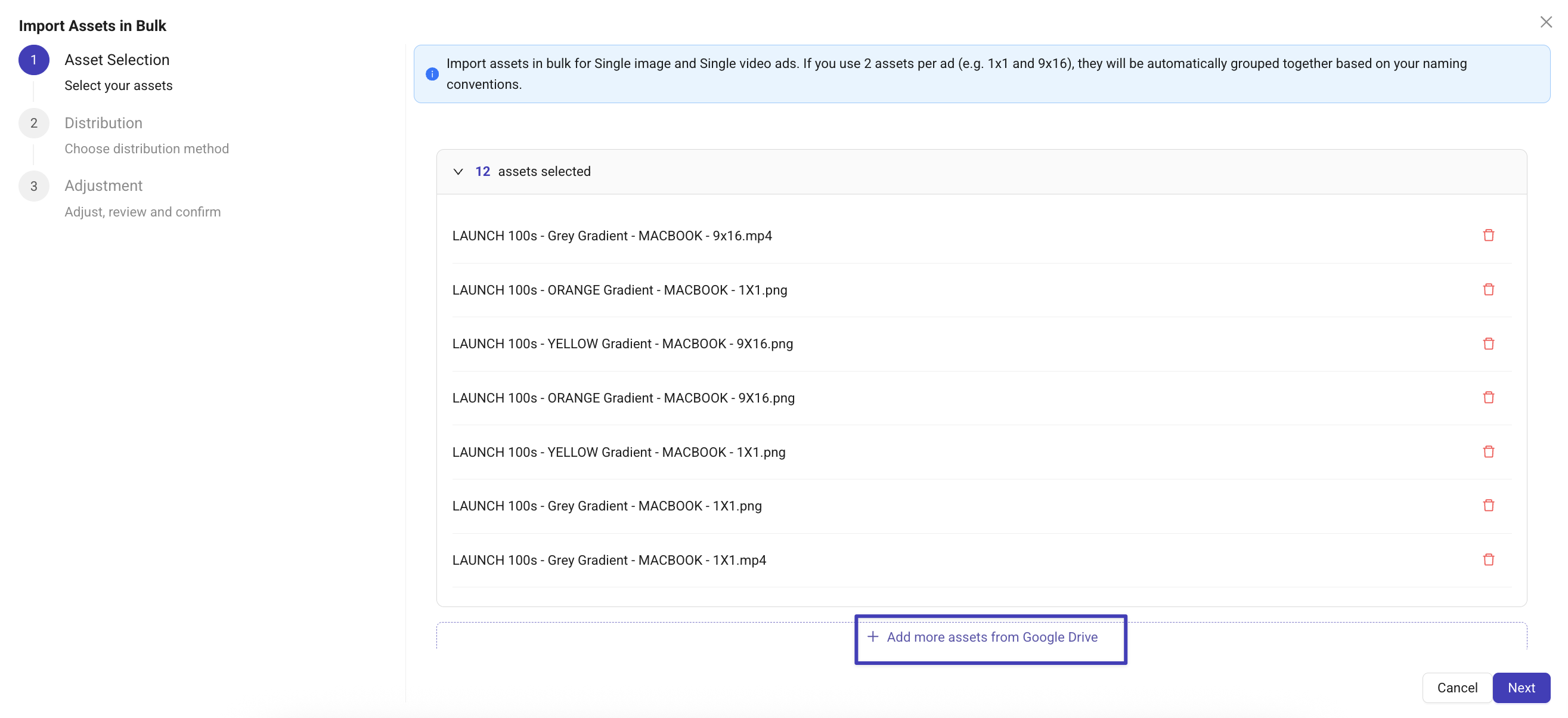 Most users work with two versions of each asset (1x1 and 9x16). Kitchn recognises these pairs automatically.