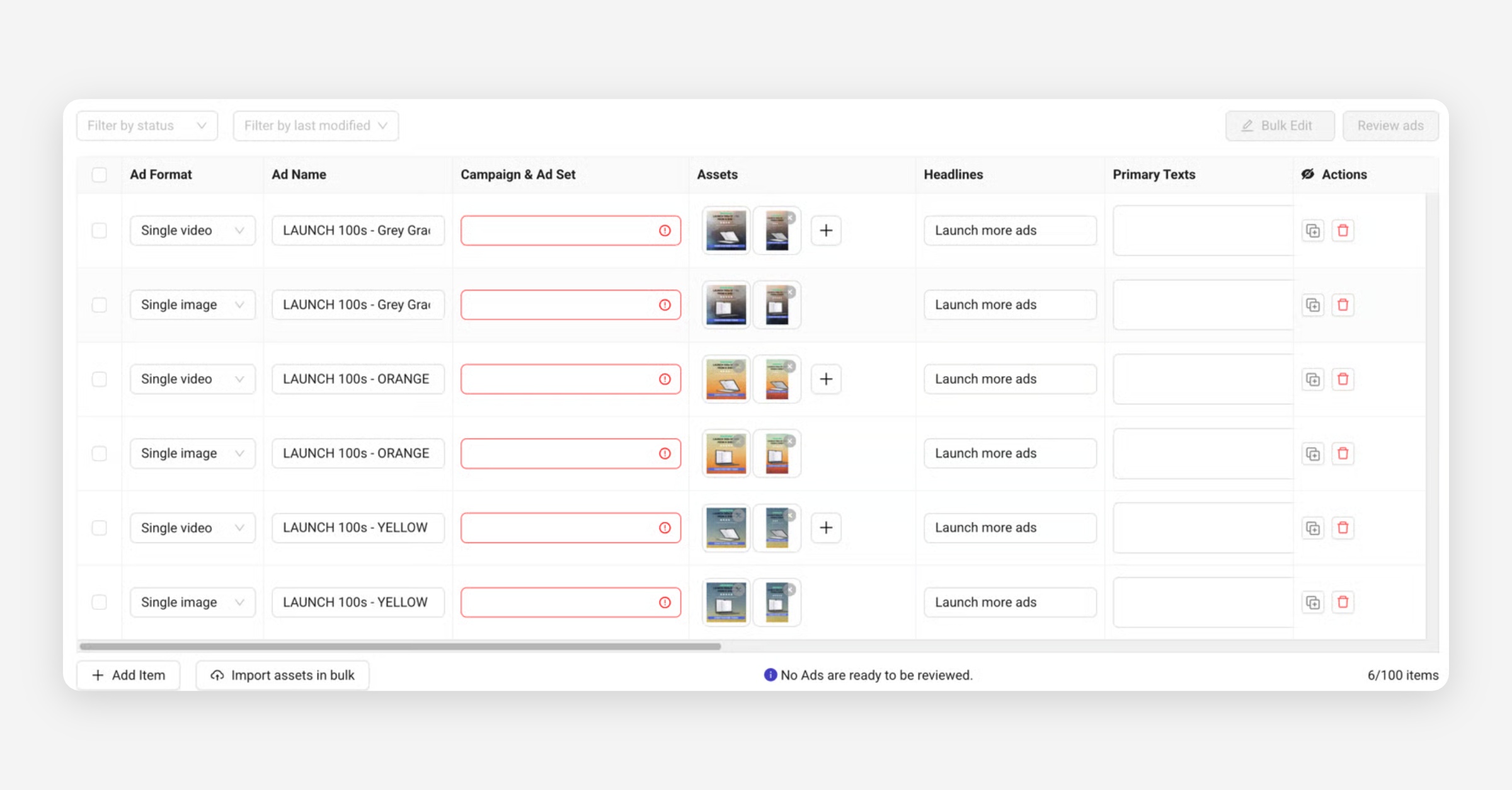 Bulk importing is the fastest way to create ads in Launch Sheets.