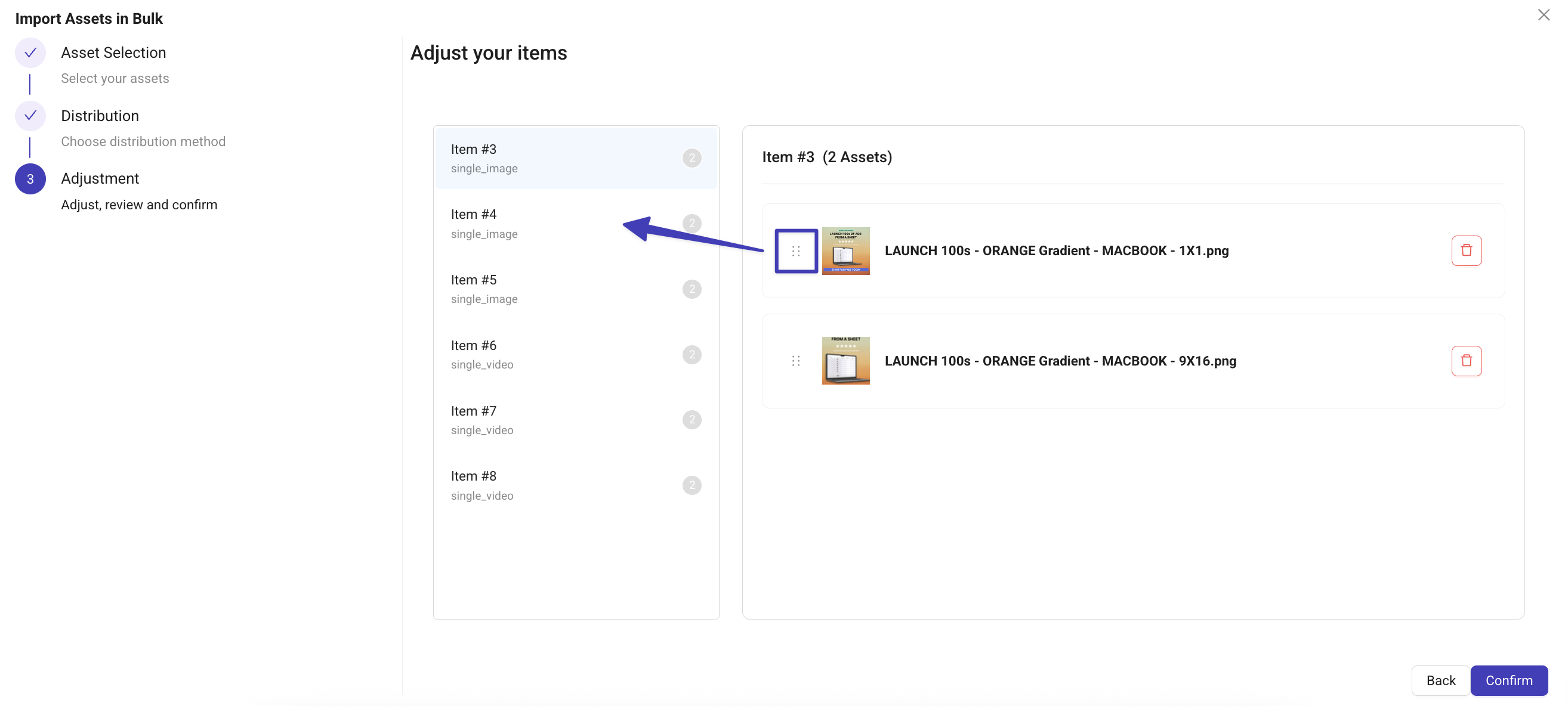 In the example below all 12 assets were correctly grouped into 6 items, with 2 assets each. You can navigate back and forth during the import flow to adjust assets or grouping. You can also adjust assets across different rows. (Use the highlighted drag & drop button above)