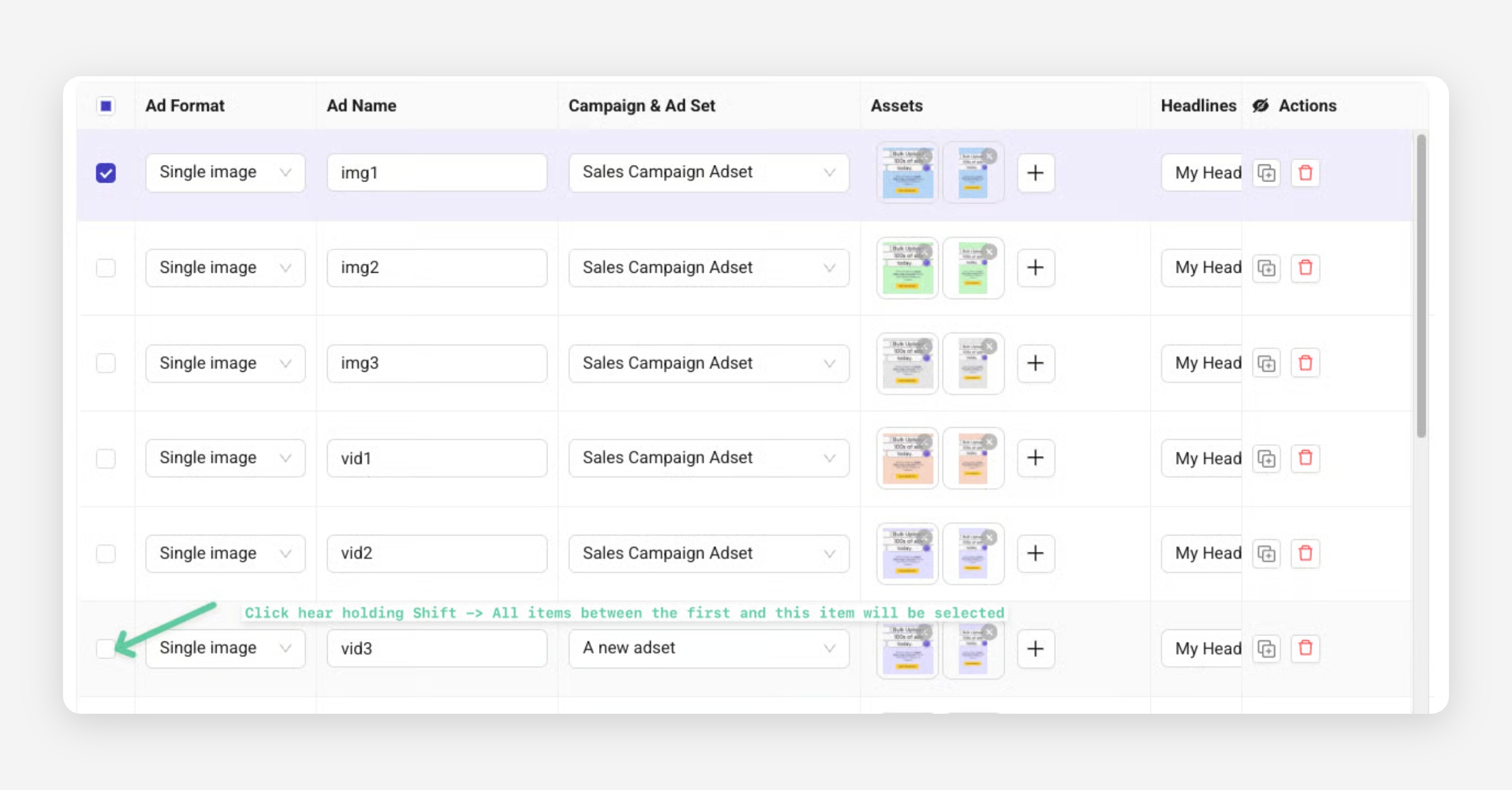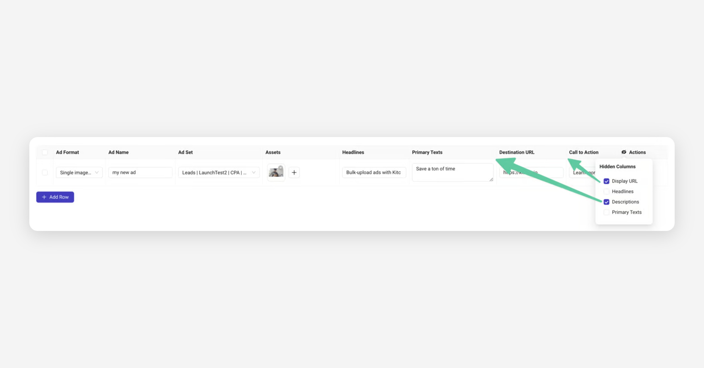Click the Duplicate Row icon to copy values from an existing ad row (except assets) and prepare additional ads.