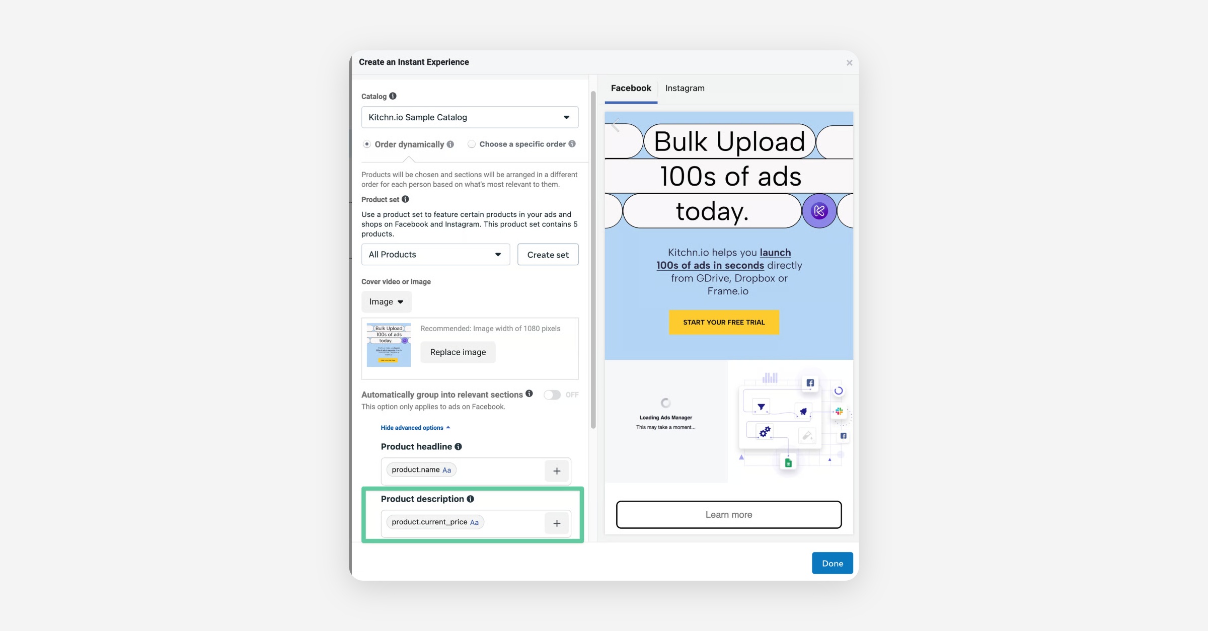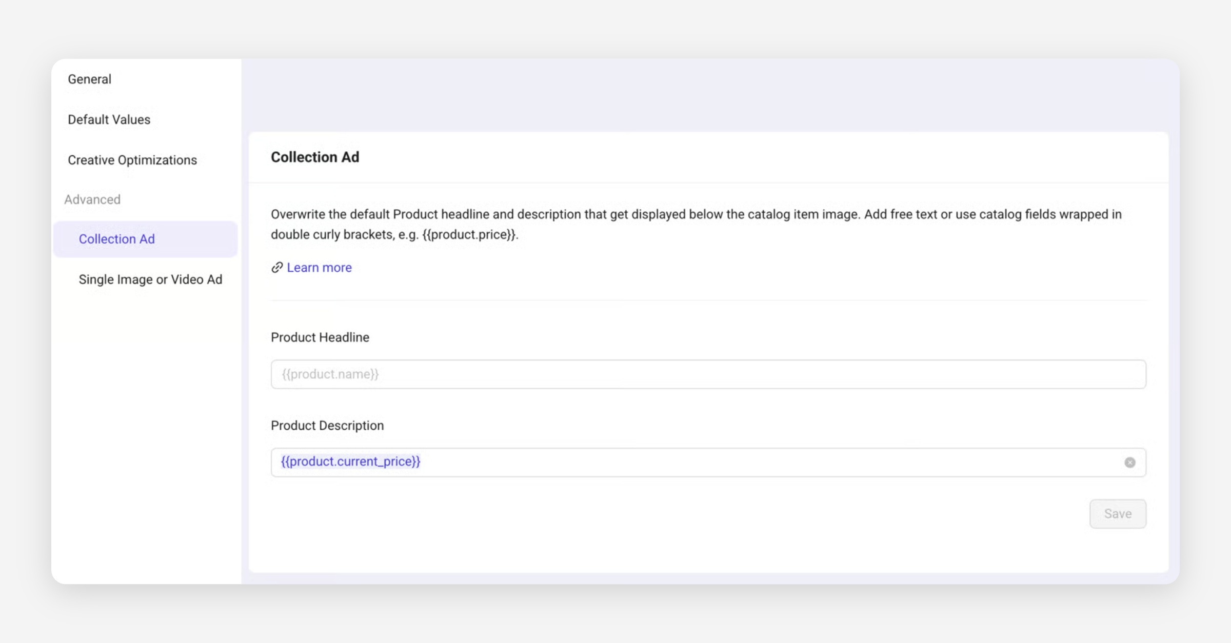 This will replace the advanced options in each of your Collection Ads' Instant Experience giving you the option to use a free text input or one of Meta's Catalog fields.