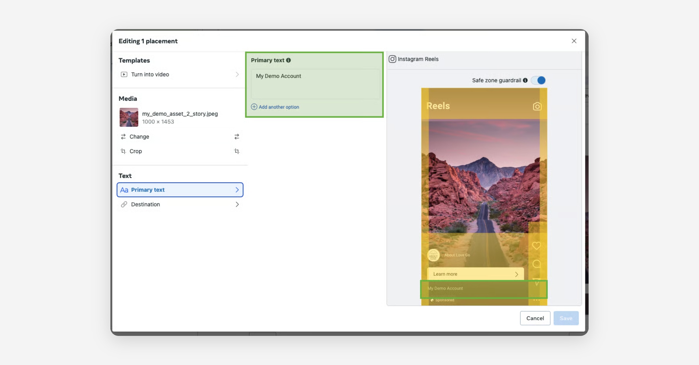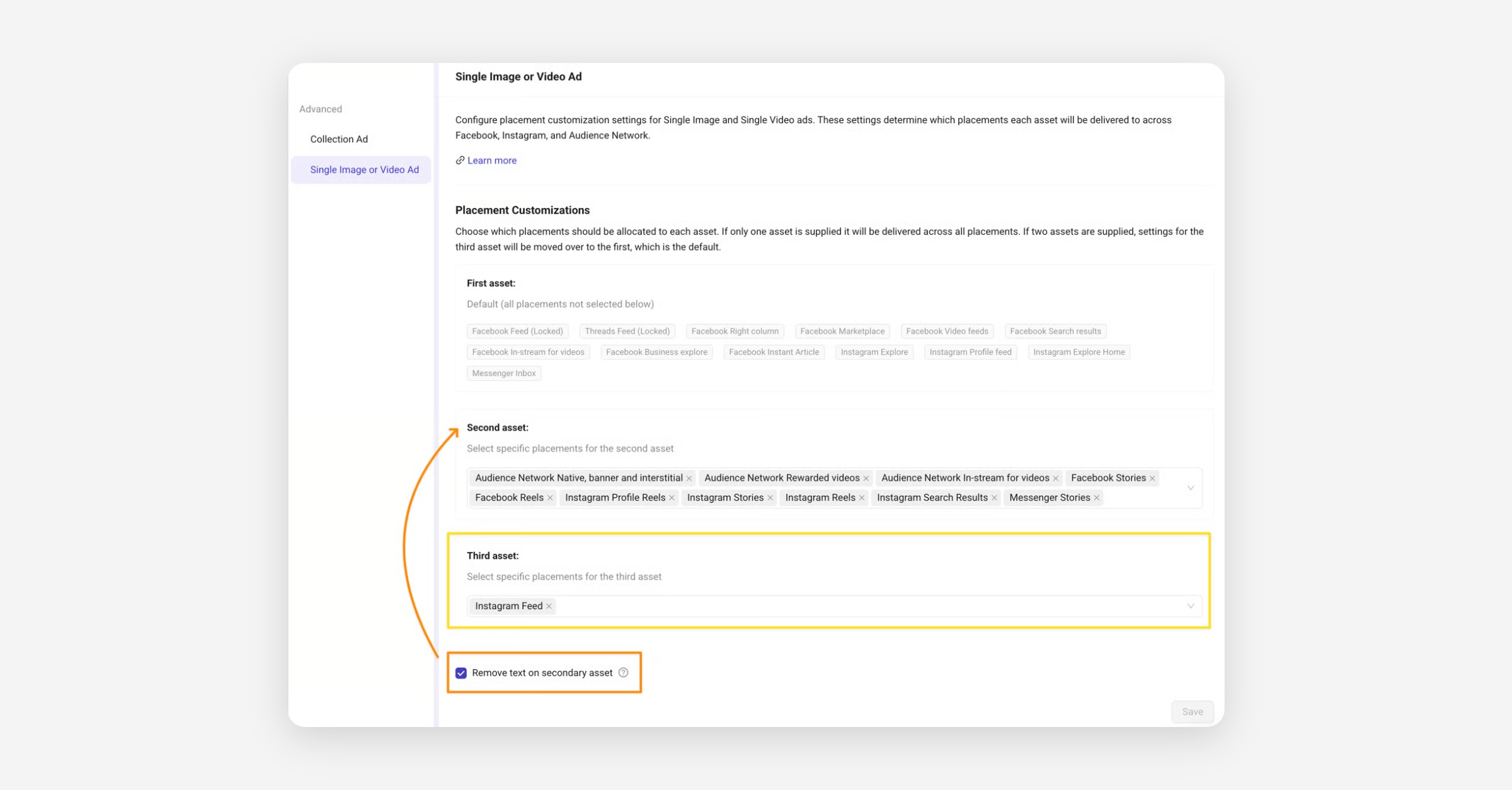 This feature removes all Primary Text for all placements that are defined for the Second Asset. The text removal takes place based on the 2nd asset, irrespective of which placements you have selected for it. Make sure the second asset placements include all Stories and Reels placements for which you want the Primary Text to be removed.