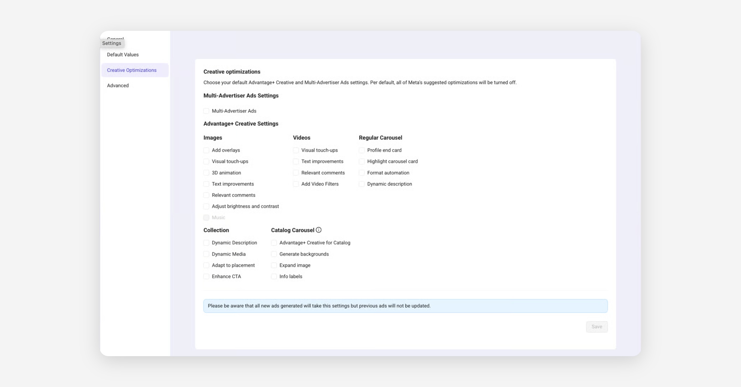 Choose your default Advantage+ Creative and Multi-Advertiser Ads settings. Per default, all of Meta's suggested optimizations will be turned off.