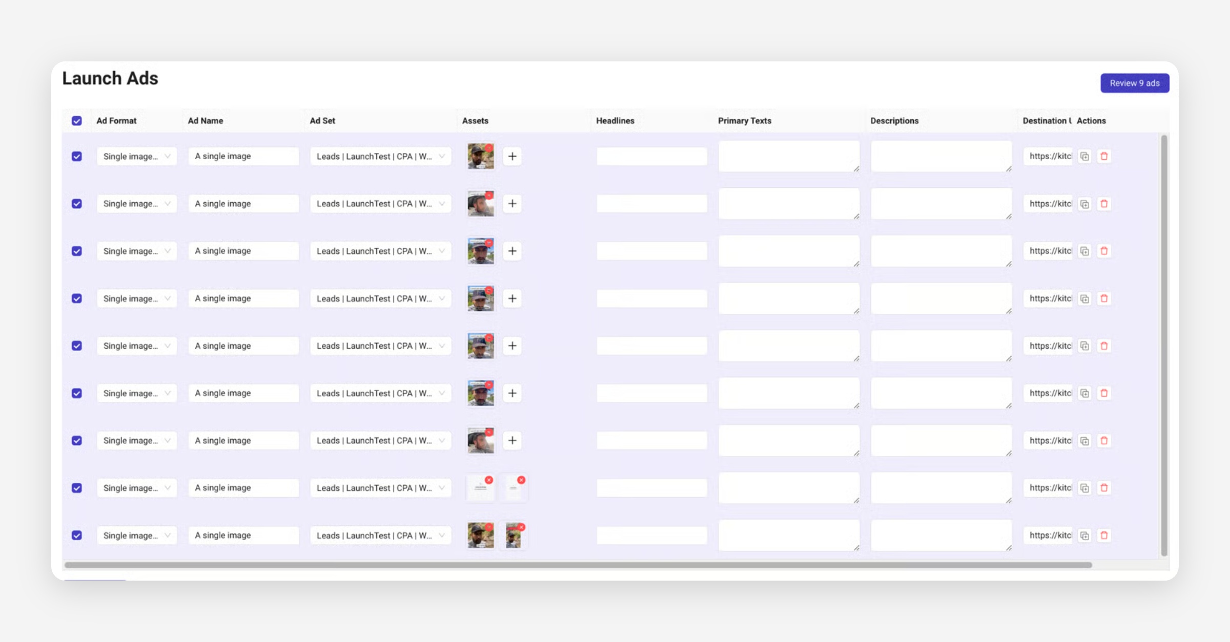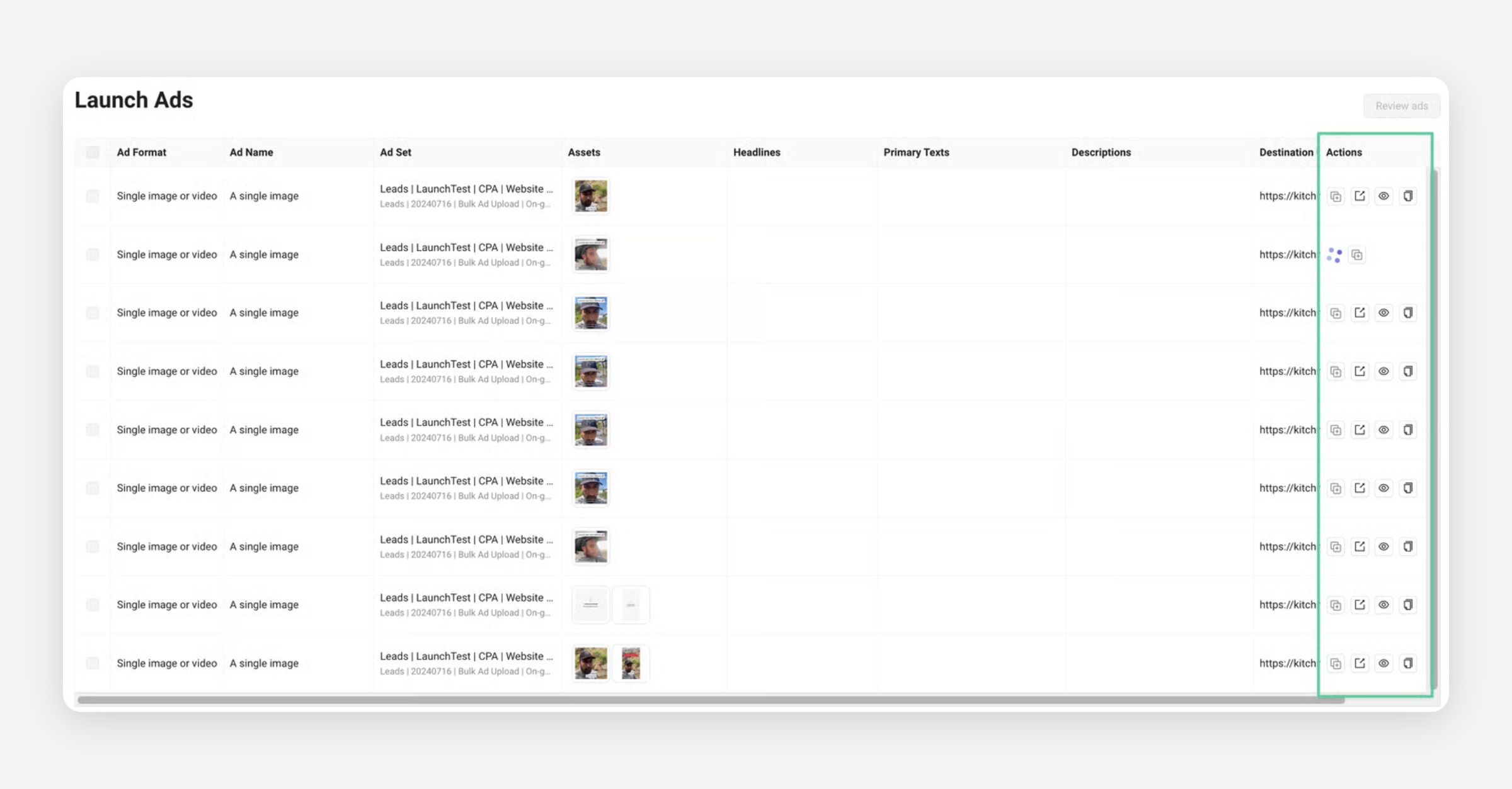 You can also duplicate any rows with published ads, which will copy all values but the creative asset over into a new row at the bottom.