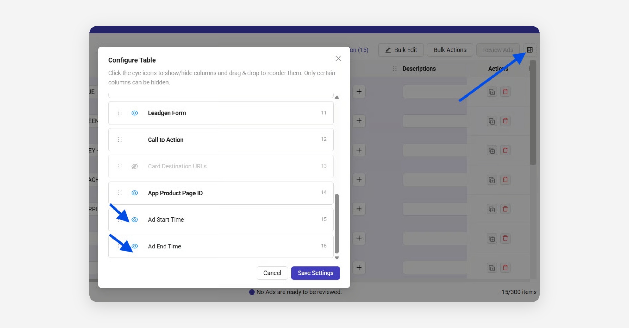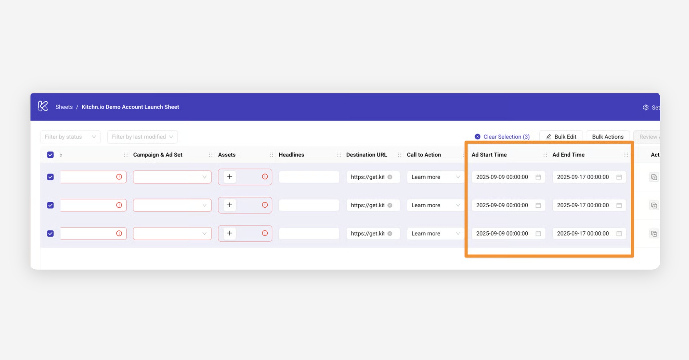 The Ad start time, and Ad end time can be set row by row, or in bulk: