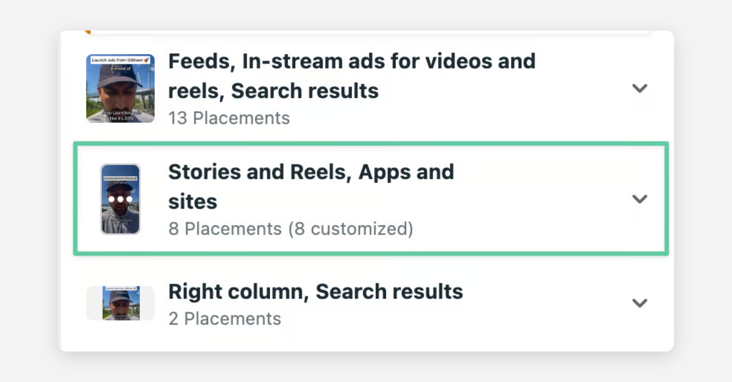 For Single image and Single video ads, the first (or only) asset will be used as the default across all placements. You may add a second asset, which will be used across all Stories and Reels placements. You may add a third asset that will be used across all horizontal placements (Right column, Search Results).