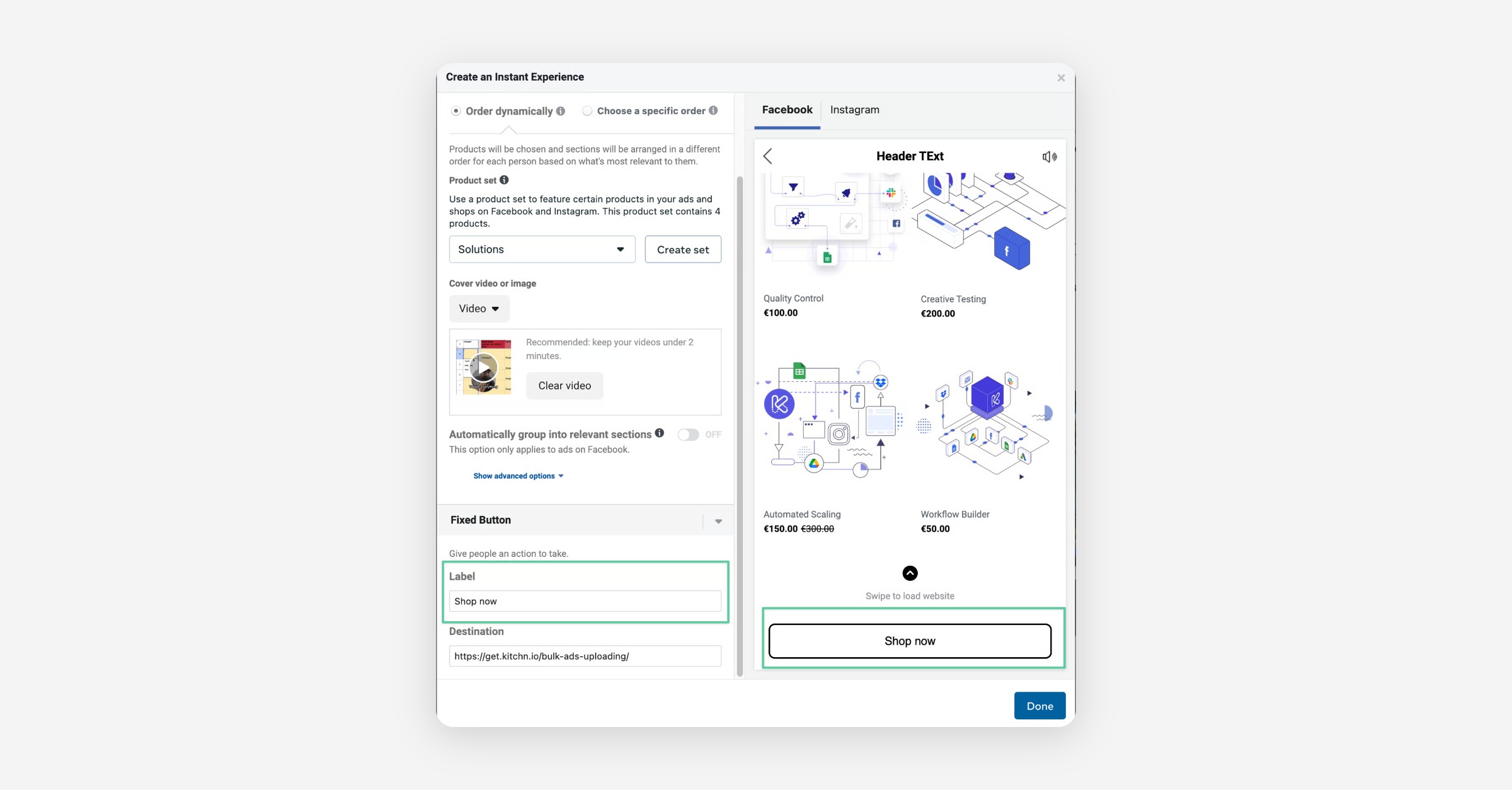 Enter a Destination URL that will be used inside of the Instant Experience as the Destination URL behind that fixed button